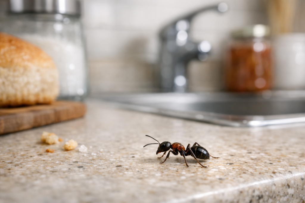 Once inside, ants are driven by one mission: locating food and moisture. Kitchens, bathrooms, and pet areas offer exactly what they’re searching for. This includes crumbs, spills, grease traces, and water sources from sinks or leaky pipes. Even spotless homes can attract ants because they can detect the faintest scent trails. When a scout finds something worthwhile it will lay down pheromones that guide hundreds of others straight to the source, turning a small problem into a fast‑growing infestation.